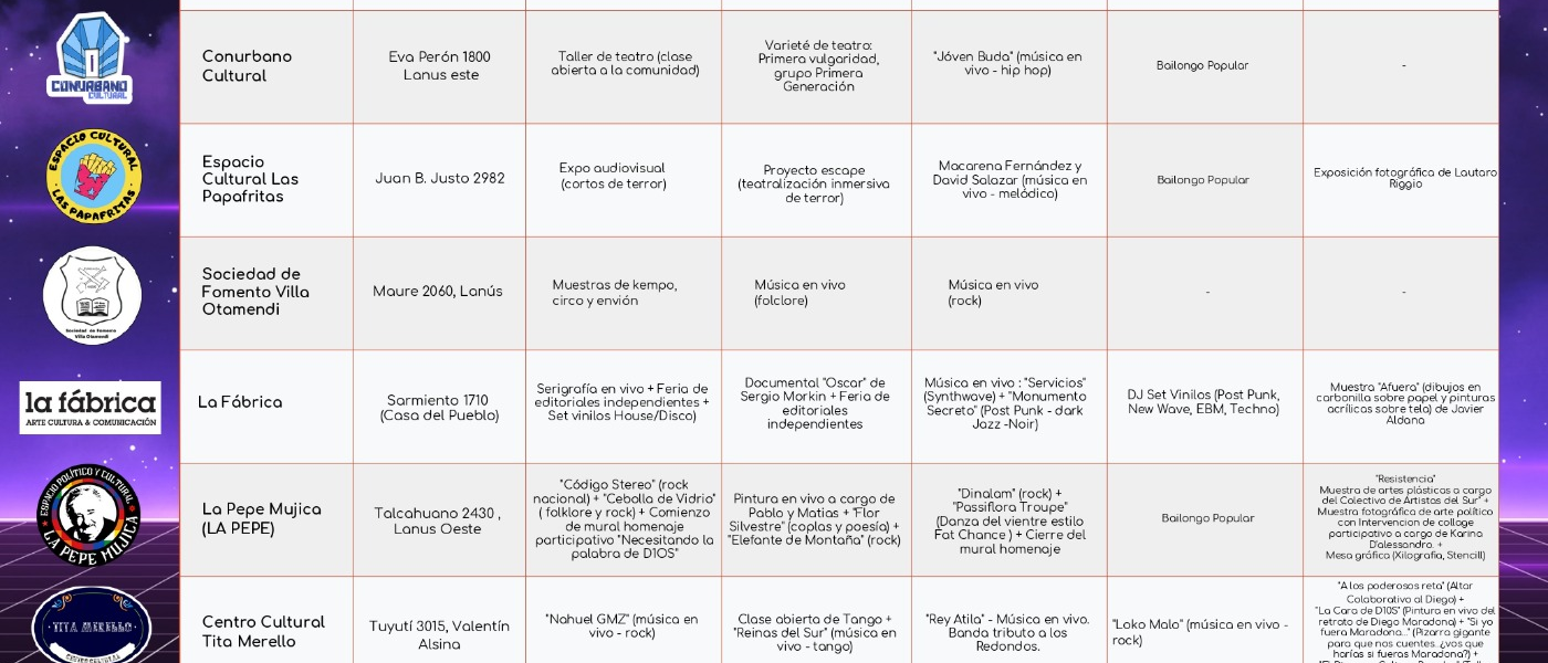 El Bosque de Natamacca, Babia, Conurbano Cultural, Espacio Cultural Las Papafritas, Sociedad de Fomento Villa Otamendi, La Fábrica, La Pepe Mujica (LA PEPE), Centro Cultural Tita Merello, Club Atlético 9 de Julio y Centro Cultural Kiken, serán los espacios culturales que abrirán sus puertas