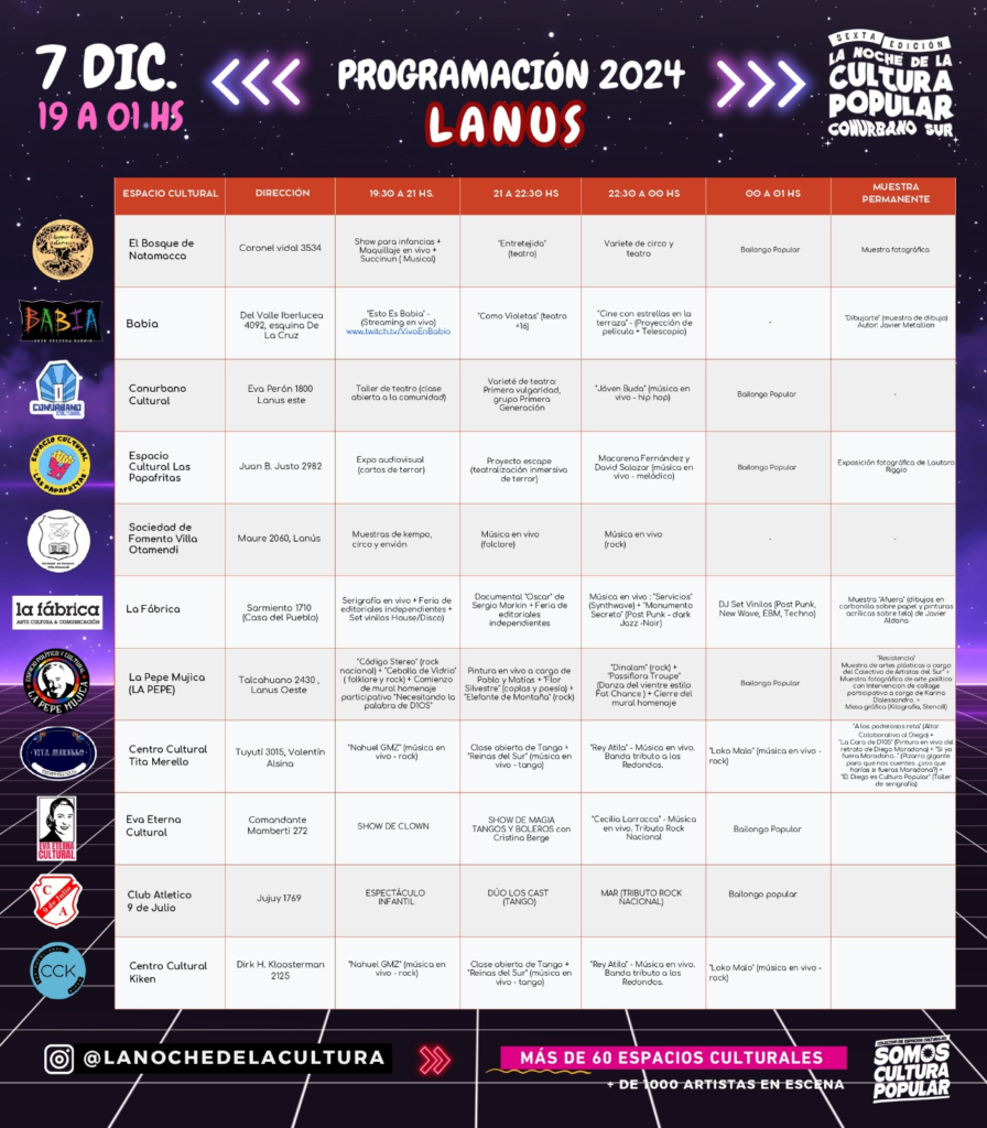 Este sábado 7 de diciembre se estará celebrando La Noche de la Cultura Popular en el Conurbano Sur. Lanús, es uno de los distritos que se suma a esta incitativa la cual tendrá lugar desde las 19 hasta las 01.00 horas.