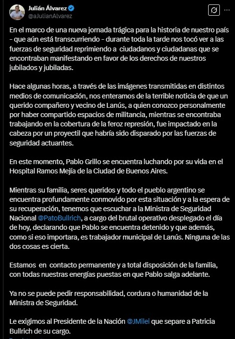 Hace algunas horas, a través de las imágenes transmitidas en distintos medios de comunicación, nos enteramos de la terrible noticia de que un querido compañero y vecino de Lanús, a quien conozco personalmente por haber compartido espacios de militancia, mientras se encontraba trabajando en la cobertura de la feroz represión, fue impactado en la cabeza por un proyectil que habría sido disparado por las fuerzas de seguridad actuantes“, expuso.
